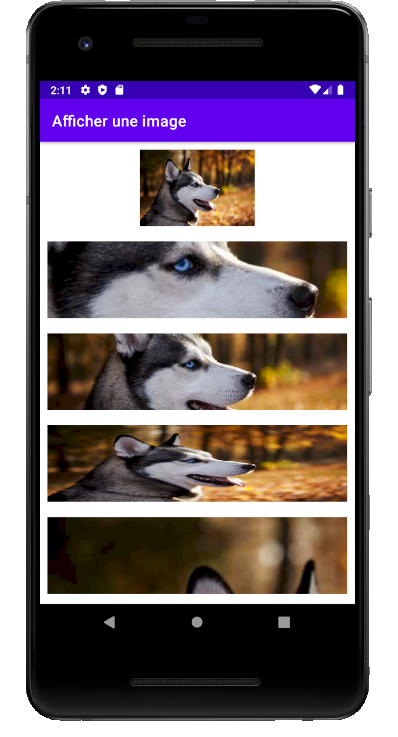 Ce petit programme affiche cinq fois la même image à l'aide du composant ImageView. L'attribut android:scaleType permet de redimensionner ou décentrer cette image. Cette dernière doit être de type "bmp", "gif", "jpeg" ou "png" et être stockée dans le répertoire "res/drawable".